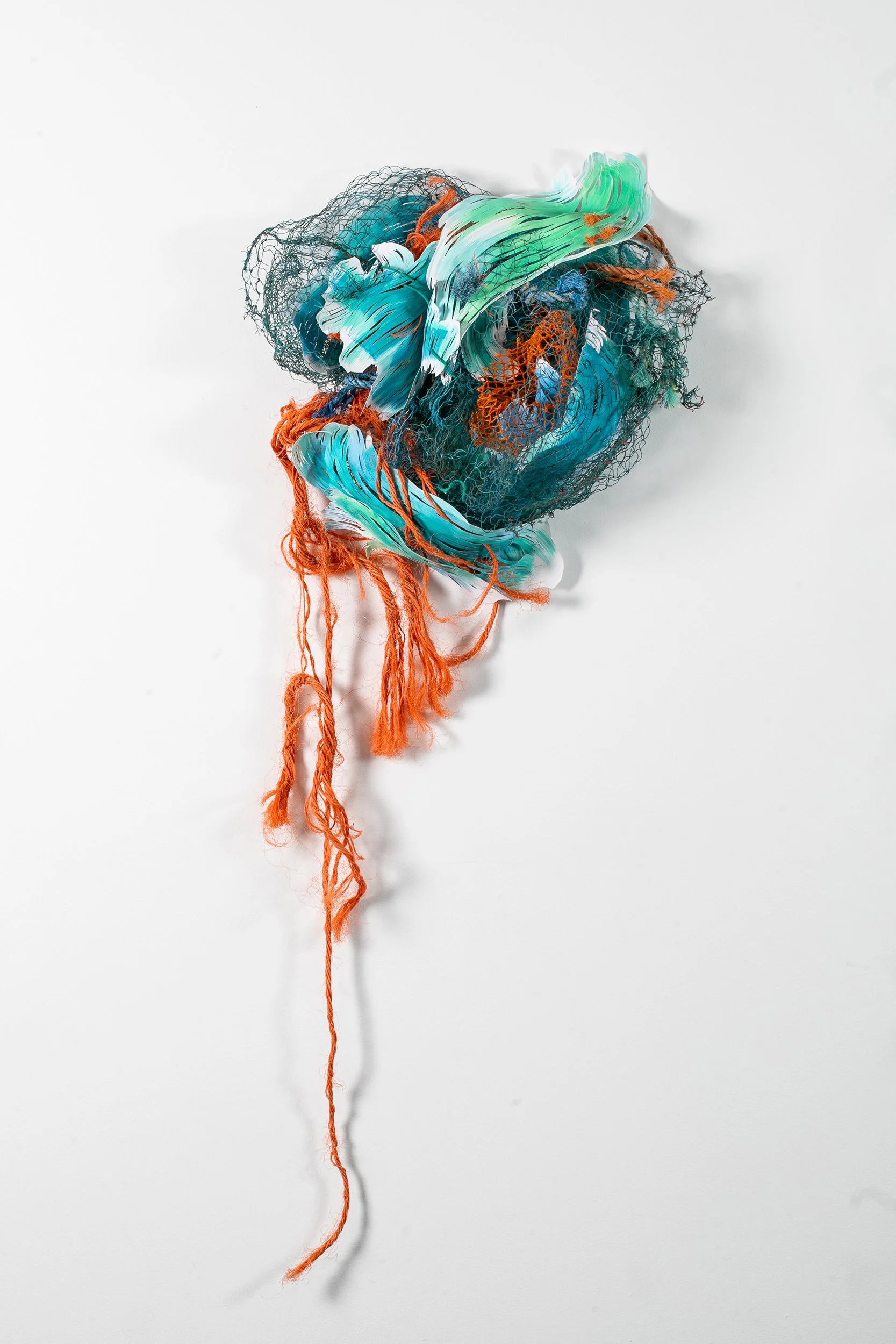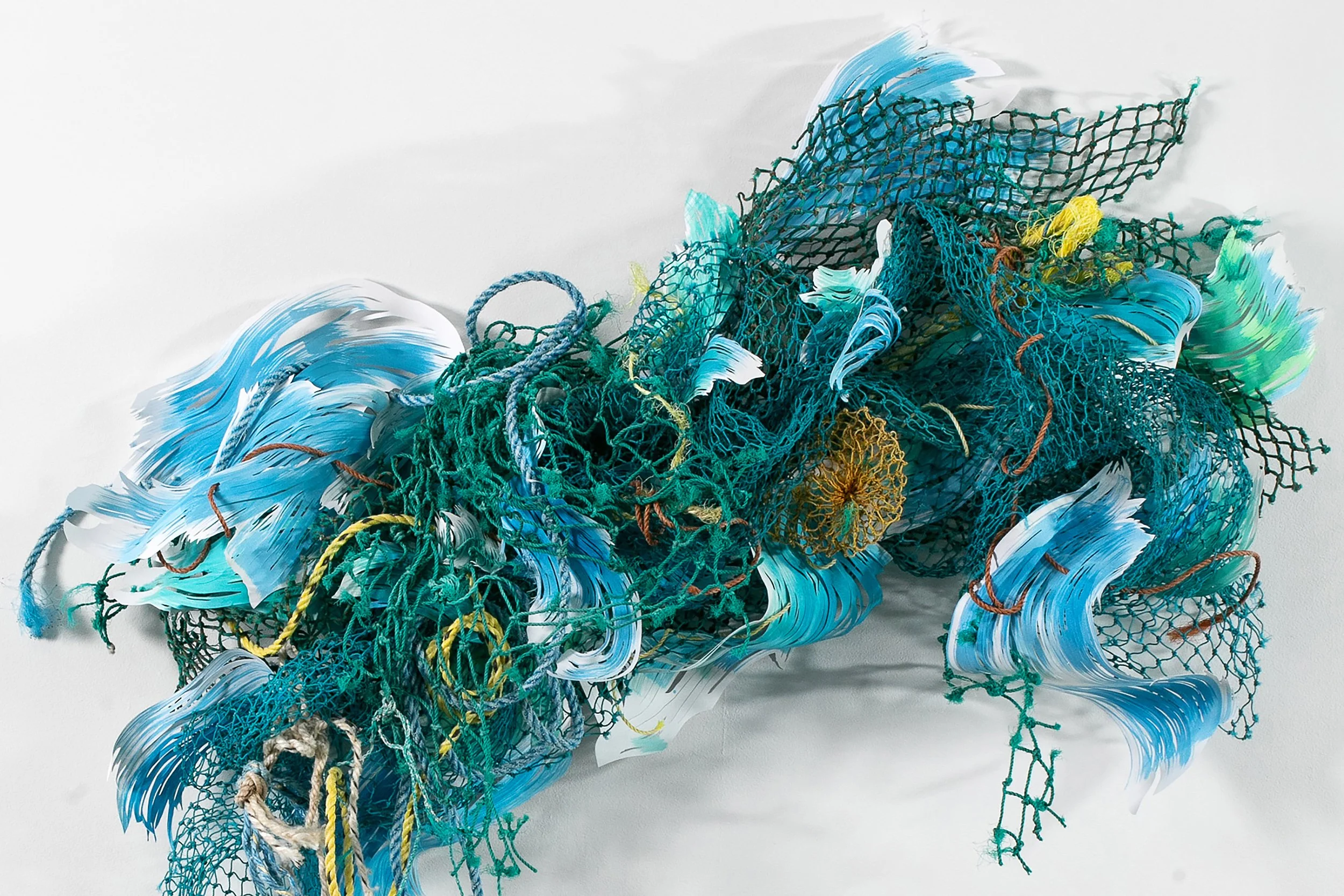 These new sculptures are made of painted and cut paper and “ghost gear,” fishing nets and rope salvaged from the Atlantic Ocean that trap and kill marine animals decades after fishing expeditions end. They evoke the drama and brutality of plastic’s invisible war on life “below the brine.”